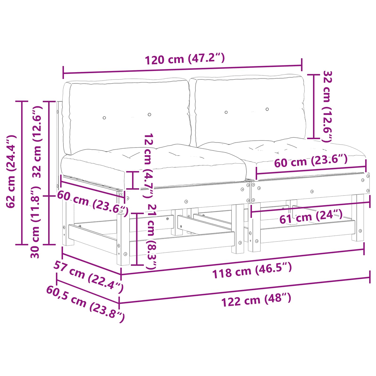 - 2 x Mellansoffa:61 x 60,5 x 62 cm(L x B x H)