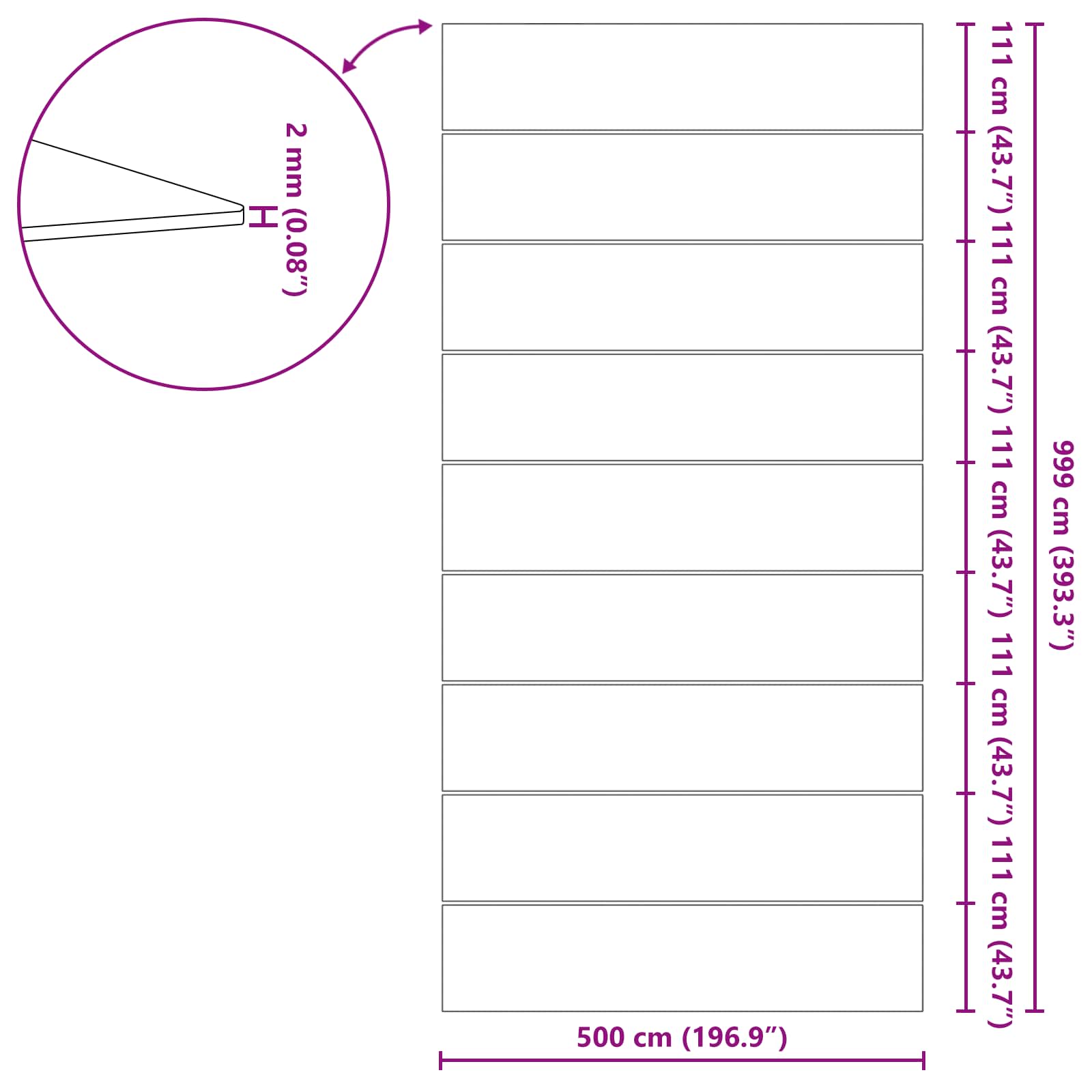 - Övergripande dimensioner: 999 x 500 x 0,1 cm (L x B x H)