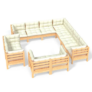 Loungegrupp med gräddvita dynor 11 delar massiv furu