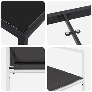 - Material: Trädgårdssoffan är tillverkad av Textilene, känt för sina snabbtorkande och slitstarka egenskaper, vilket ger både komfort och hållbarhet. Härdat glas får det att se snyggt ut och ger en praktisk matplats.